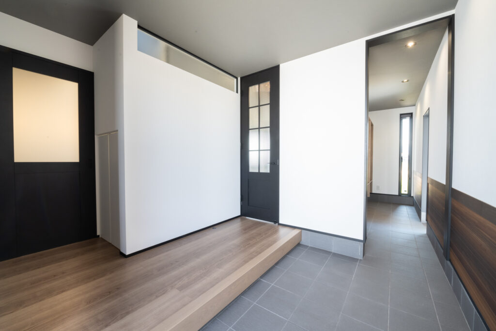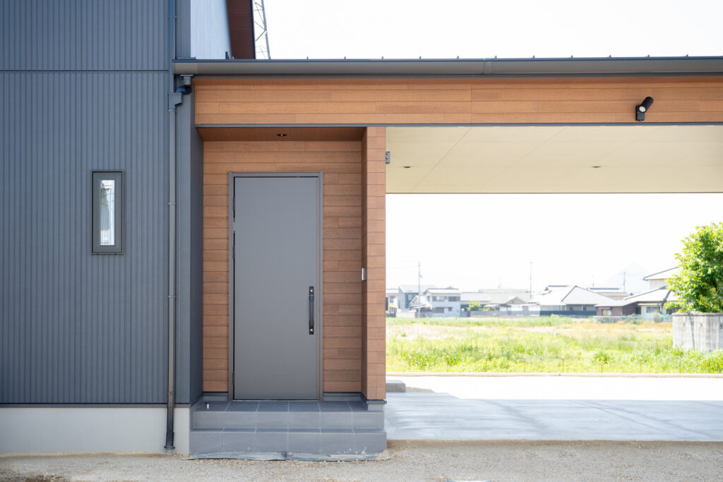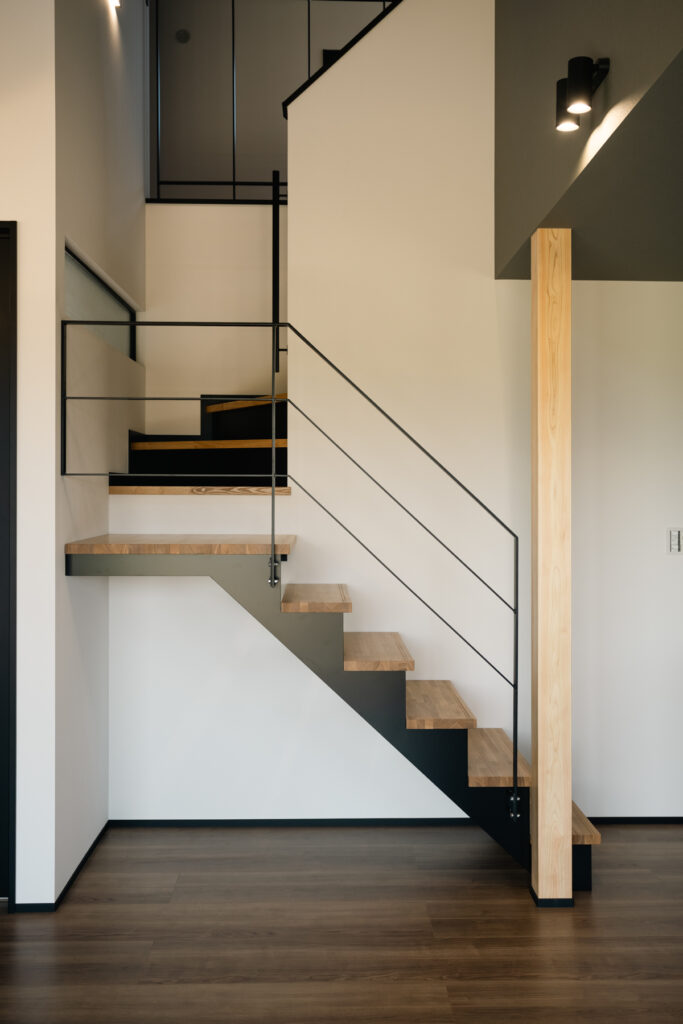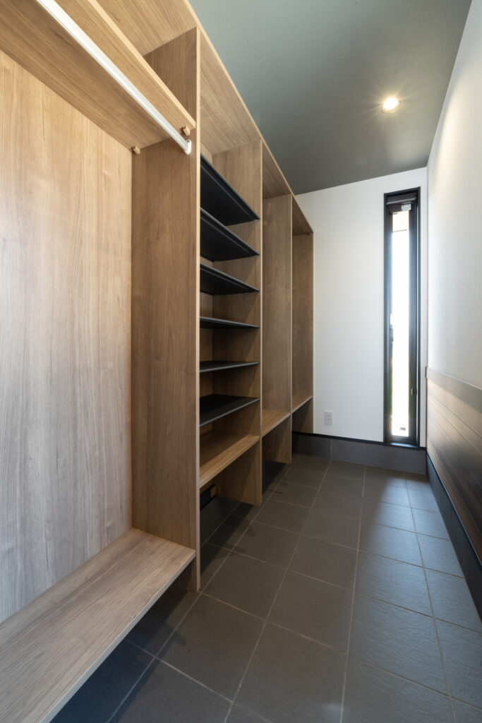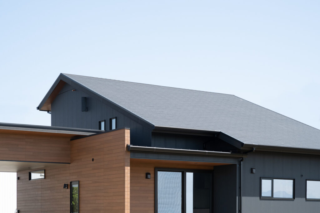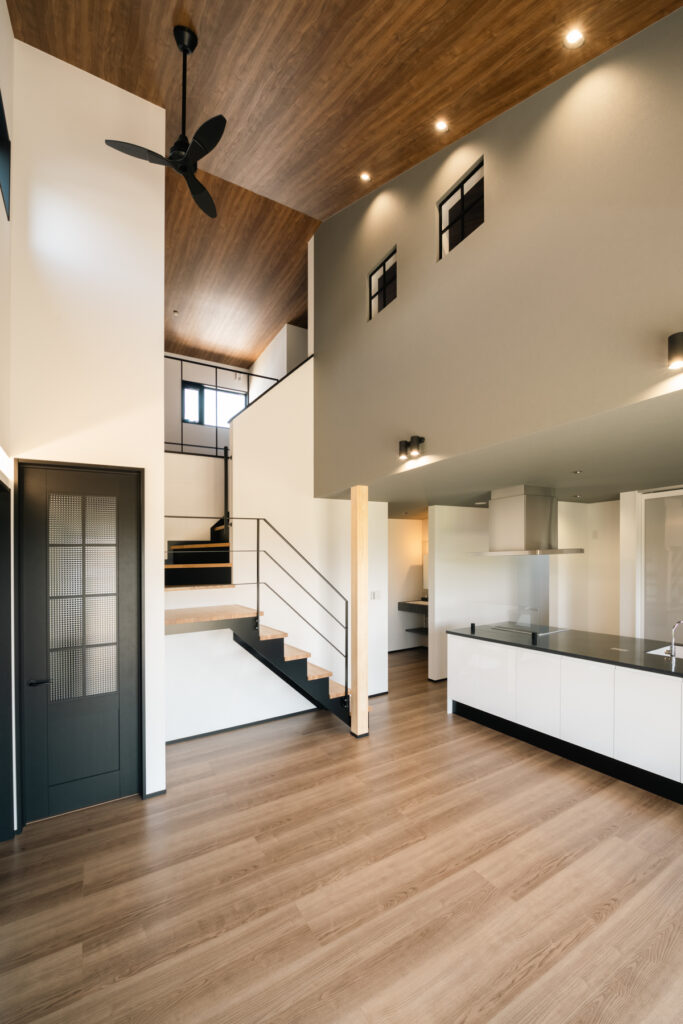 子育て真っただ中のご夫婦のために、家族5人が心地よく暮らすための工夫を詰め込んだ住まいです。黒と木目の対比が凛とした印象を放つ外観は、シンプルながら存在感があります。「どんな天気でも、家族がスムーズに動ける家にしたい」という願いが、間取りの隅々まで息づいています。