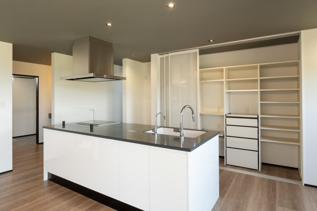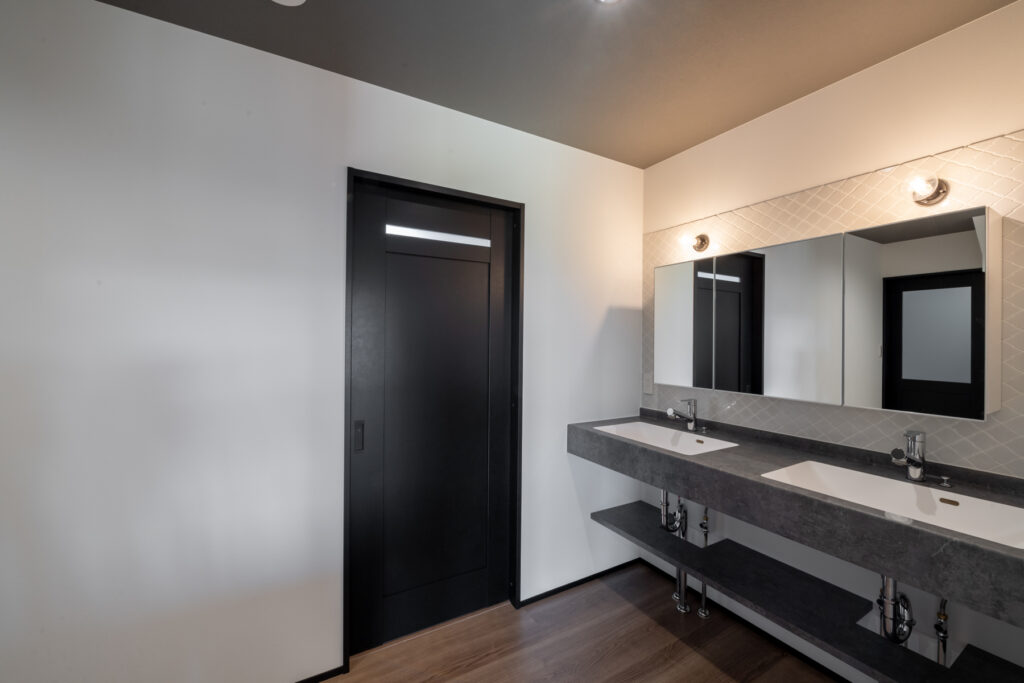 360度ぐるりと回遊できるキッチンは、調理をしながらお子さまの様子をいつでも確認できます。背後には扉を閉めれば生活感を隠せる大容量の棚を設置。いつでも気兼ねなくゲストを招待できます。洗面まわりはゆとりある2ボウル仕様で、朝の忙しい時間帯でも家族が並んで身支度できる実用的な場所です。