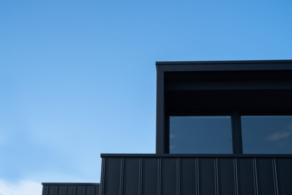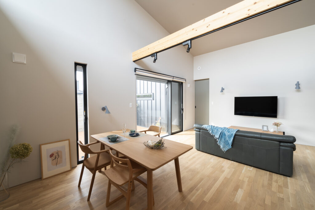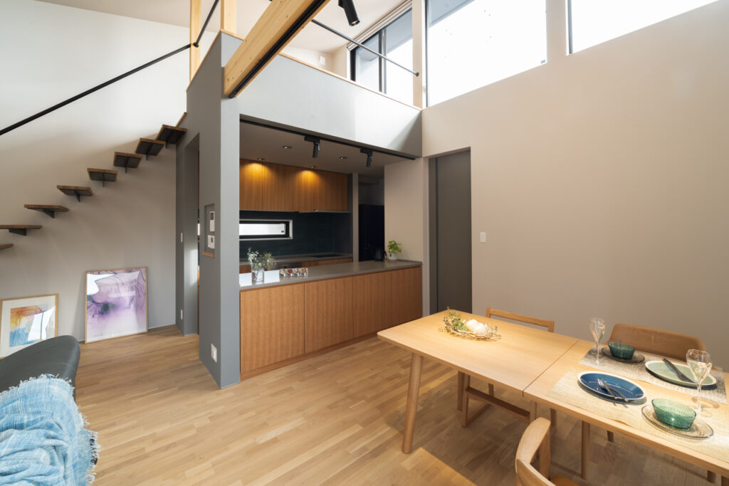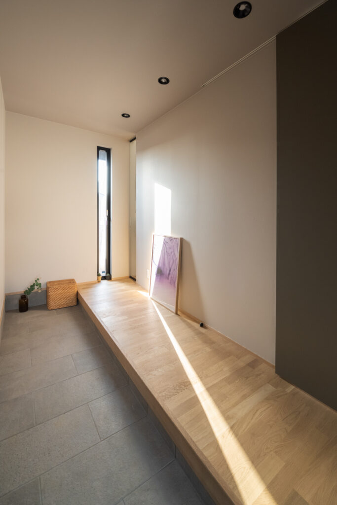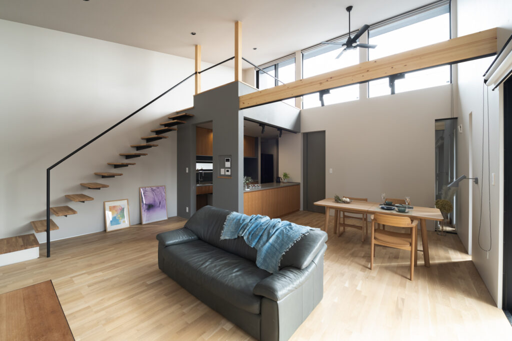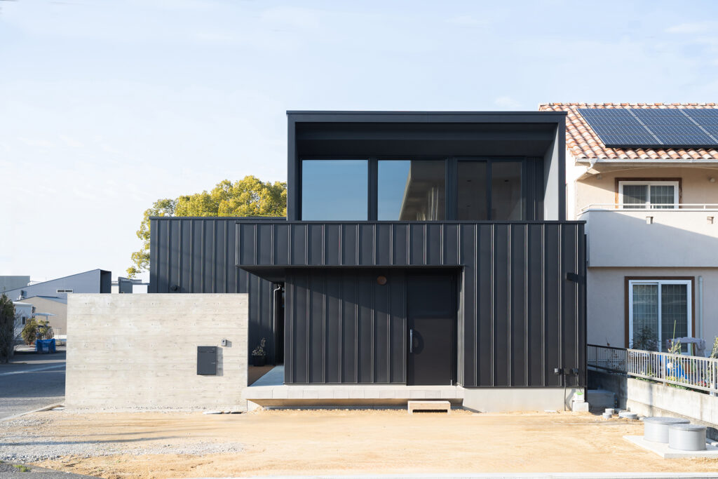 黒をまとった外壁と、木目の表情を刻んだ石壁。一見、相反するふたつの素材が、この平屋では驚くほど自然に溶け合っています。インダストリアルというスタイルを軸に据えながら、ご夫婦とお子さまの3人が「ここに住みたい」と感じられる温度感を大切にした住まいが、静かな存在感を放っています。