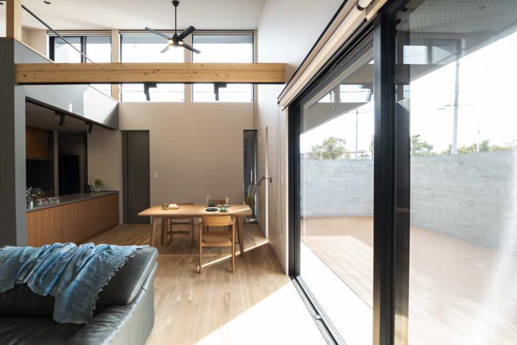 リビングの延長に広がる中庭は、屋根を持たない「もうひとつのリビング」です。石壁がぐるりと囲む大らかな空間では、お子さまがボールを追いかけ、ご夫婦はのんびりと空を見上げる。テラスと庭が一体となった構成が、屋内と屋外の境界をゆるやかにつなぎ、家族それぞれの過ごし方を受け止めます。