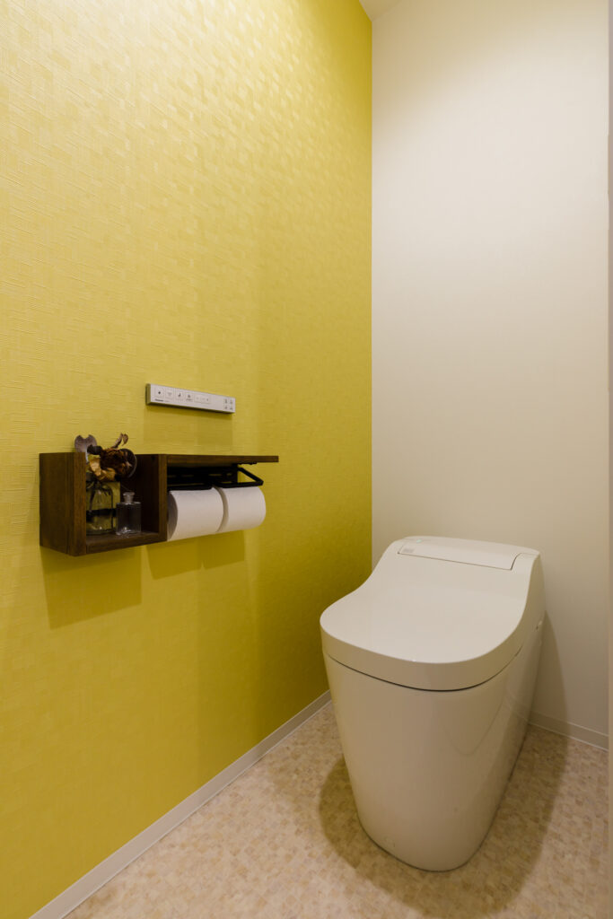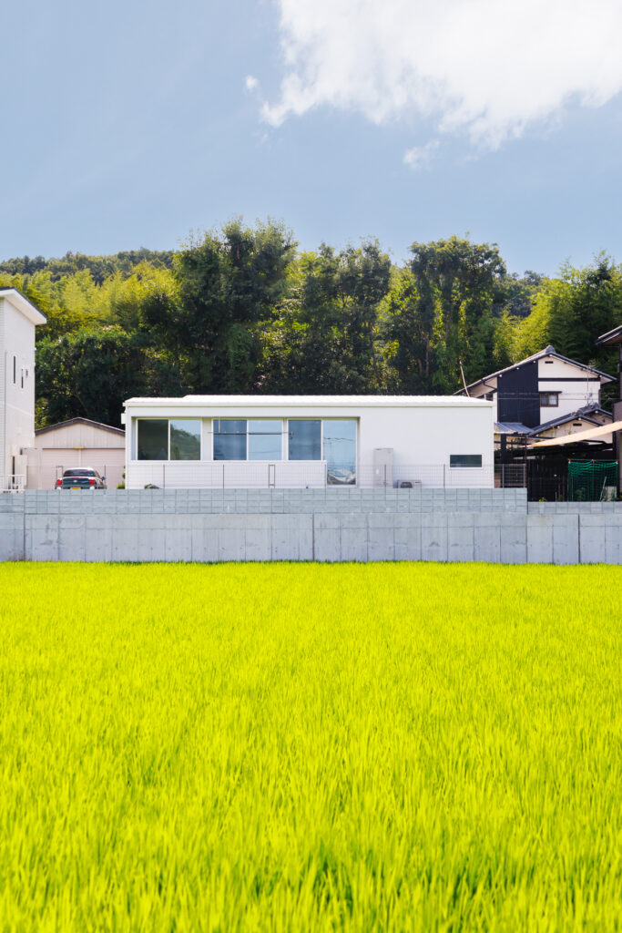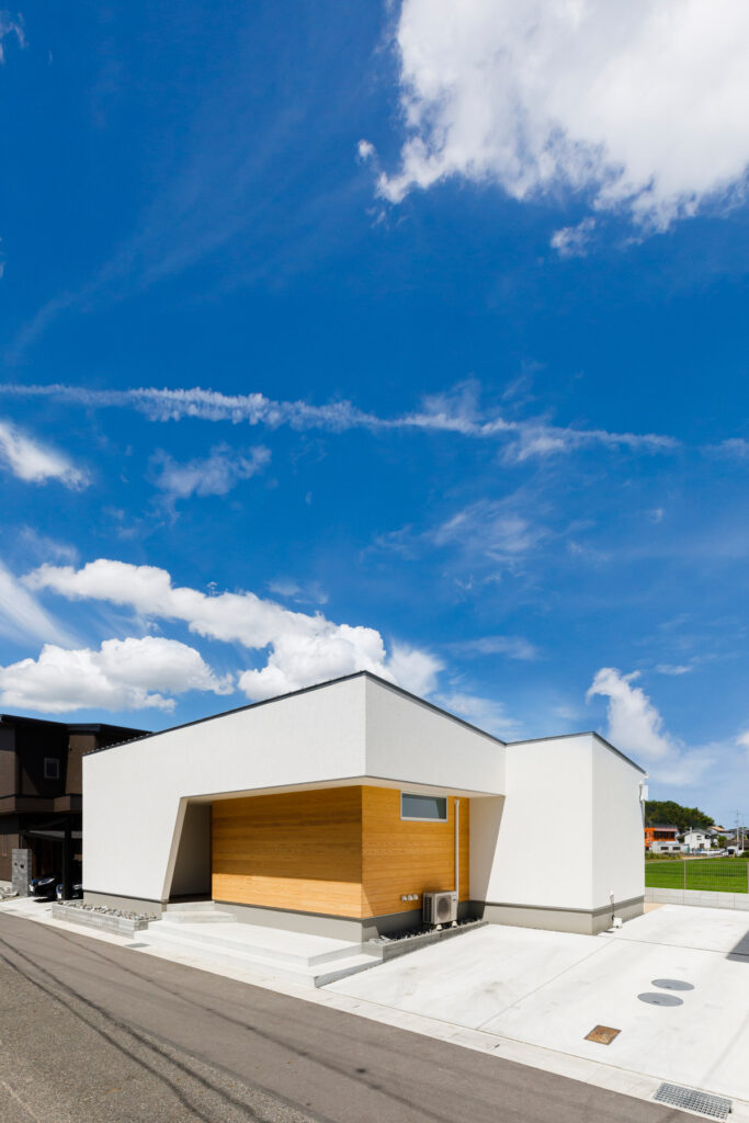 白の塗り壁に杉板のアクセントを施した外観が、スタイリッシュな佇まいを演出。書道教室兼自宅として設計されたこの平屋は、生徒さんが居室に入らず完結できるよう、玄関からトイレ・手洗い・教室へと続く動線を分離しました。教室用の部屋は全面ホーロー壁とし、汚れても拭くだけで落とせ、磁石がくっつくため、作品の展示にも最適です。