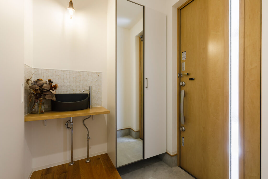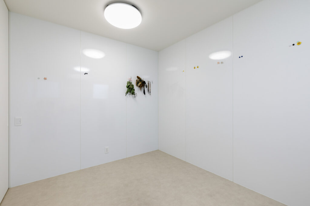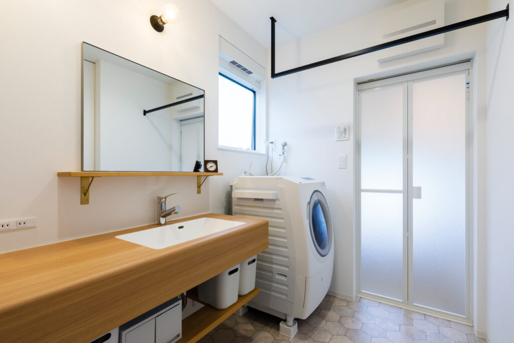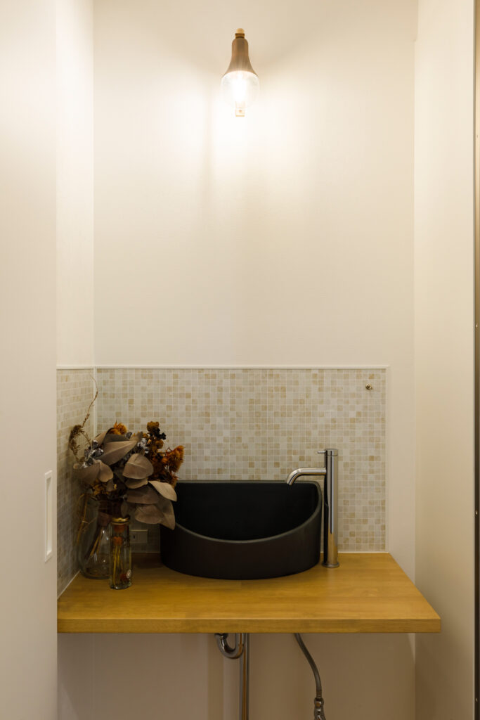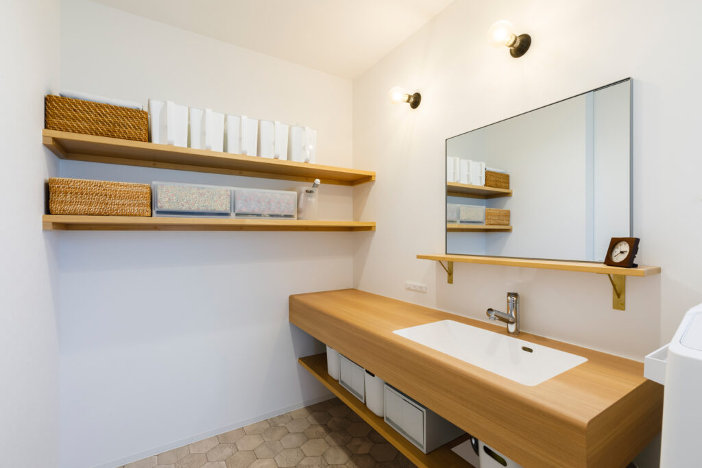 リビングに隣接する和室は寝室としても使用し、畳の香りと柔らかな感触が安らぎをもたらします。洗面は造作とし、空間に合わせた独自のデザインを実現しました。ホーロー壁の教室、畳スペースのあるリビング、田園を望む窓が織りなす構成が、仕事と暮らしの境界を緩やかにつなぎ、豊かな日常を紡ぎ出しています。
