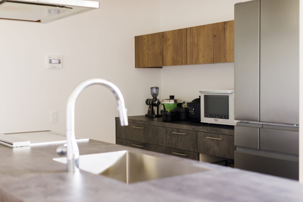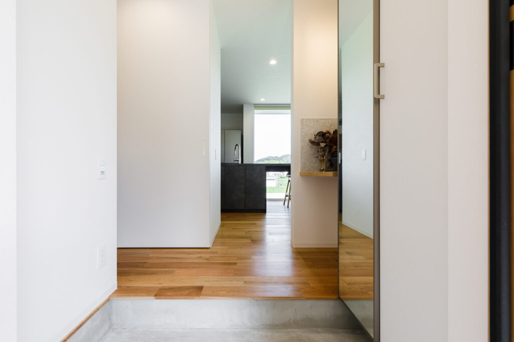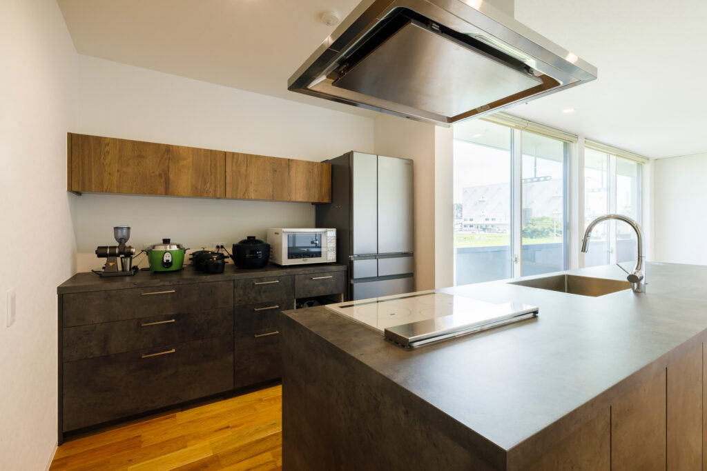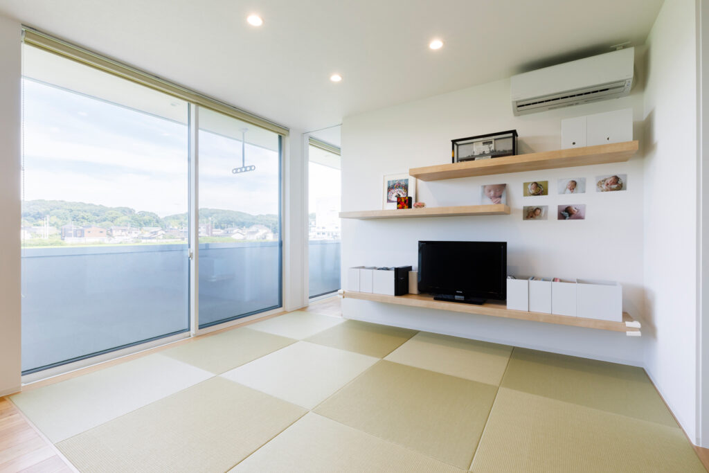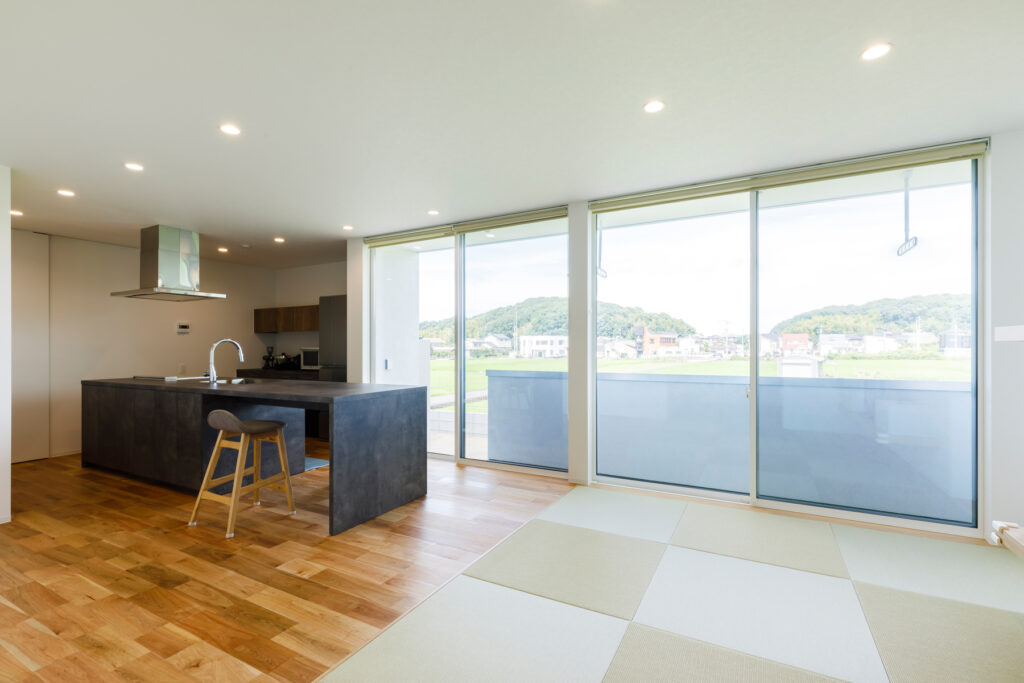 キッチンには「GRAFTEKT」の「ポポラートアイランド」を採用し、ダイニングとつながったボックス型のシンプルなデザイン。リビングには小さなお子さまが存分に遊べるよう、クッション性のある畳スペースを設けました。リビングや居室の窓からは広大な田園風景が広がり、自然の移ろいや時間の流れを眺めながら心地よい日々を過ごせます。無垢材のフローリングが、ぬくもりのある足触りを届けます。