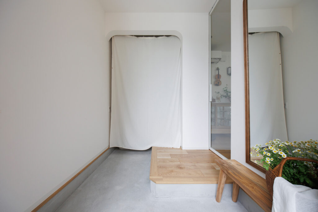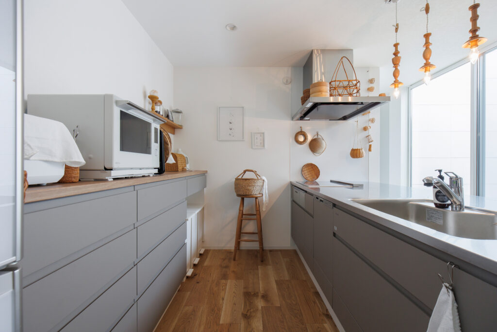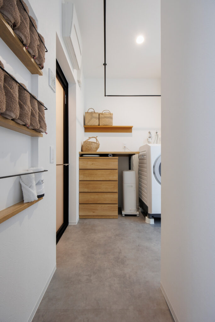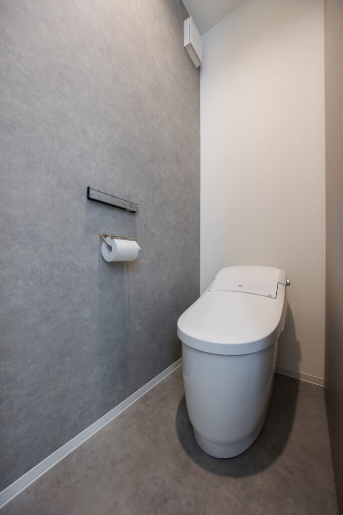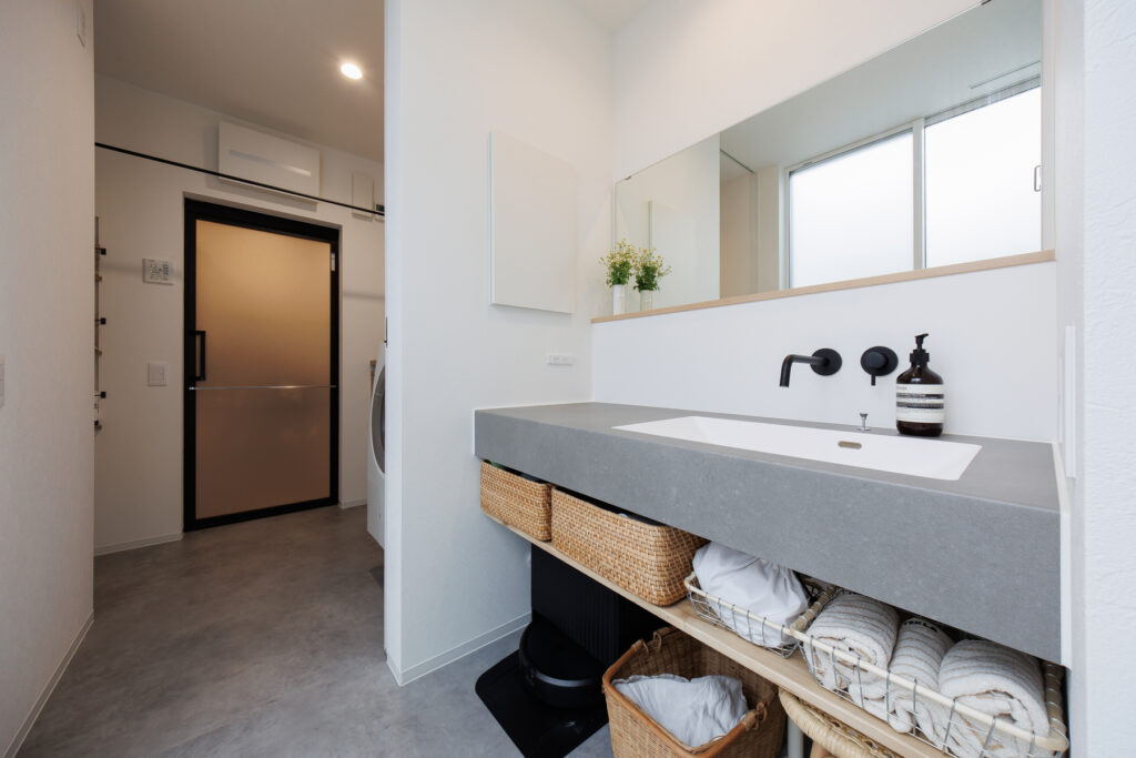 リビング・洗面所と中庭がつながり、洗濯物を干す・畳む作業をスムーズにできる動線を確保しました。トイレの壁と床はグレーとし、汚れが目立ちにくく清潔感を保ちやすい配色です。猫用トイレを置くスペースも確保し、ご夫婦と2匹の猫が心地よく共生できる住環境を丁寧に設計しています。
