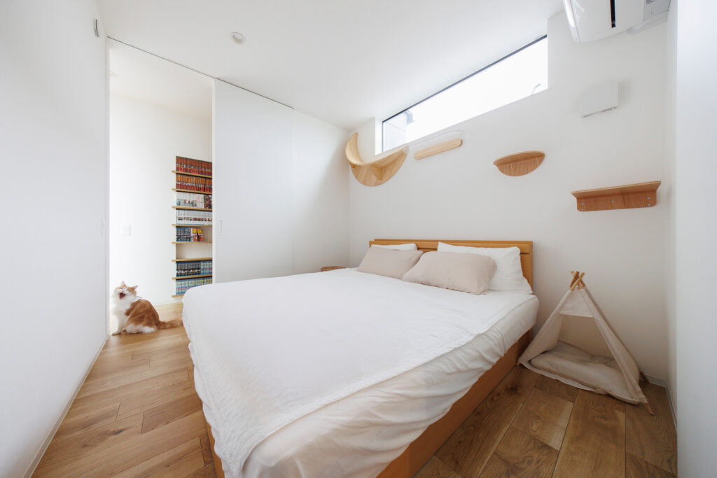 リビングと寝室の壁にはキャットステップやキャットウォークを設置し、人も猫も快適に過ごせる環境を整えています。ダイニングからベッドルームへ続く壁面には、趣味の漫画を並べる本棚を配置。移動しながら読みたい本を探せる省スペース収納です。寝室から猫用トイレへ行く壁にはキャットドアを設け、猫が自由に移動できる仕組みを実現しました。