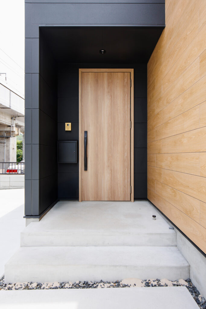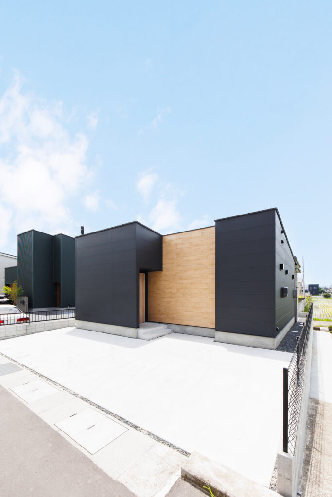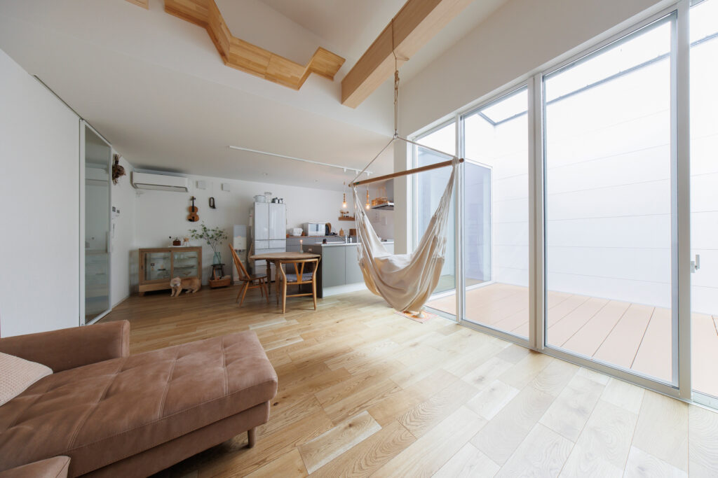 外壁は黒の外壁材にウッド調タイルをアクセントとして配し、シックな佇まいに。中庭の壁はホワイトを採用し、白い壁に反射した光が室内へ柔らかく入り込む設計です。中庭はウッドデッキとし、室内全体のデザインに統一感をもたらしました。壁も天井も白で統一されたリビングは、光が穏やかに回り、北欧×ナチュラル×ミニマルがバランスよく融合したあたたかな雰囲気を醸し出します。